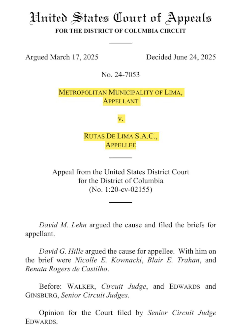 La Corte de Apelaciones para el Circuito del Distrito de Columbia rechazó la apelación de la Municipalidad de Limay confirmó dos laudos arbitrales a favor de Rutas de Lima por cerca de 200 millones de dólares.